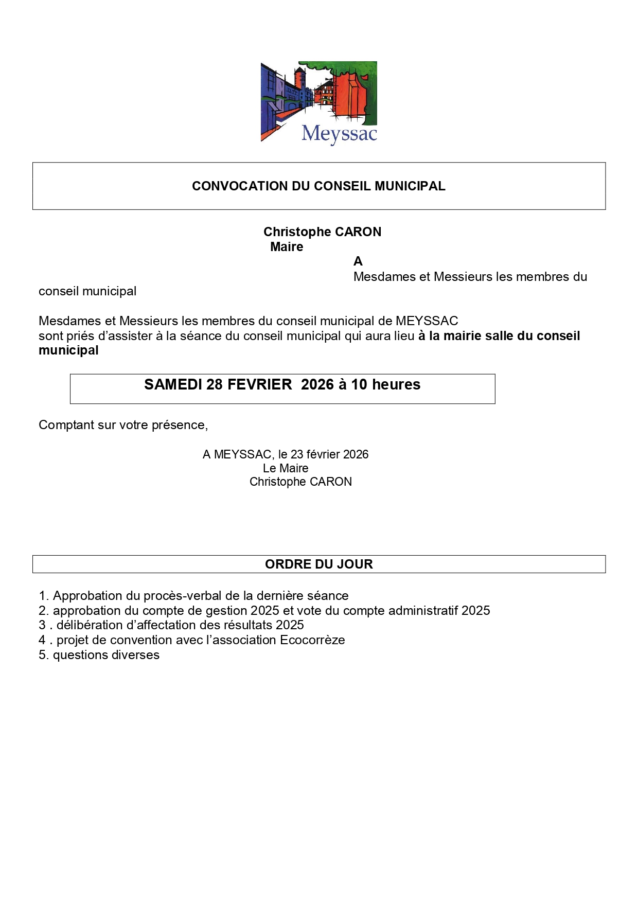 Le prochain conseil municipal a lieu SAMEDI 28 FEVRIER 2026 à 10 heures.
